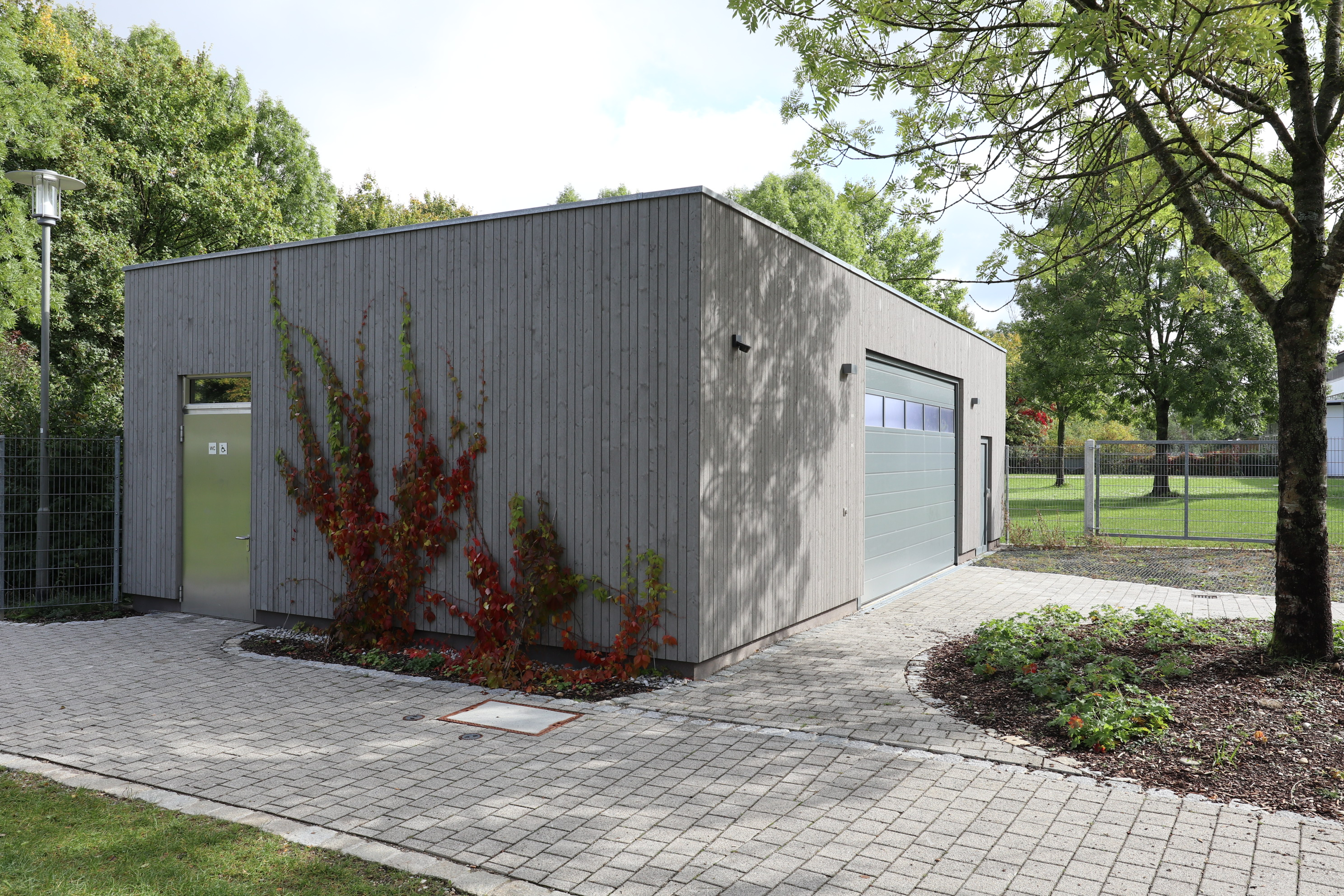 Im Zuge der Neugestaltung der „Grünen Mitte“ als zentrale Grünanlage in Untermeitingen entstand ein eingeschossiges Gebäude für Sanitär- und Lagerräume für Veranstaltungstechnik.