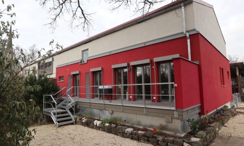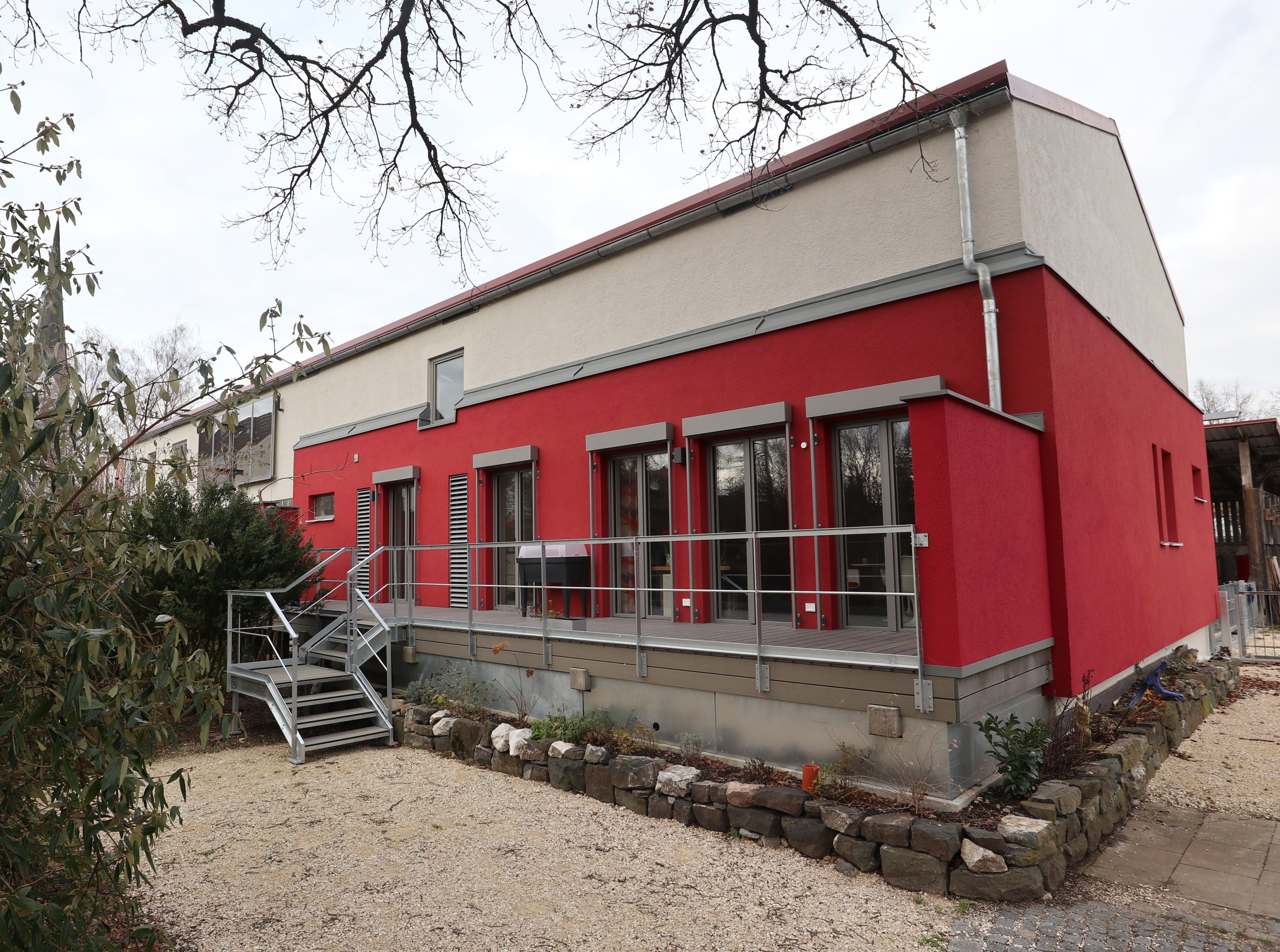 Energetisch ertüchtigt und aufgewertet mit einer neuen Fassade in leuchtendem Rot entstand so durch die Umwidmung eines Bestandsgebäudes neuer Wohnraum inmitten der Stadt.